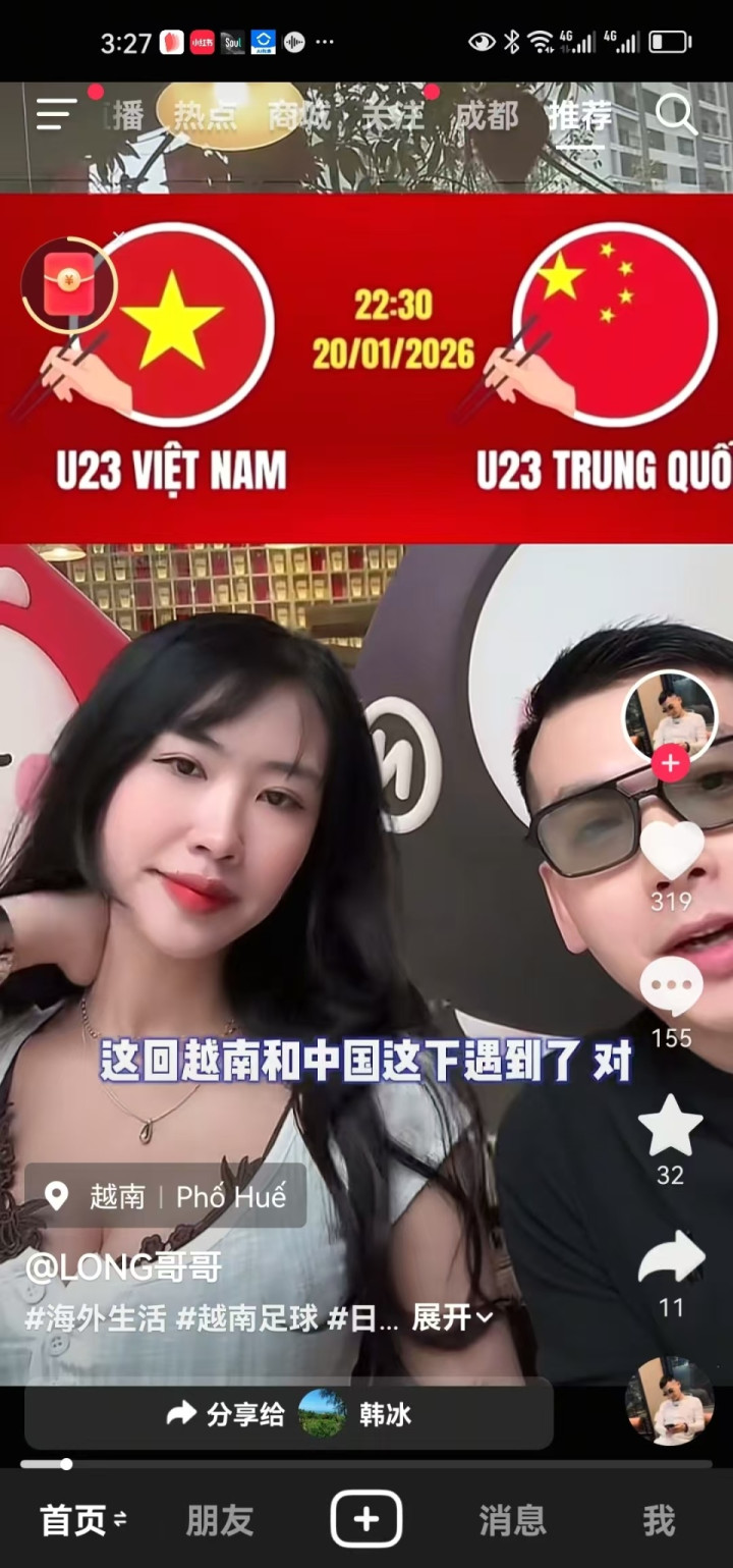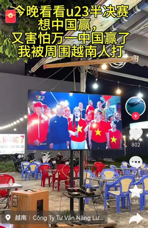 还有在越南的中国球迷,选择到宽敞的路边餐馆,开云体育app边吃饭边和很多越南球迷一起看比赛,当中国队2-0领先后,他们立即发视频自我调侃:“要不要赶紧撤,要不等会会不会挨打?”这都是自黑的说法,越南人在公开场合还是很文明、礼貌的。