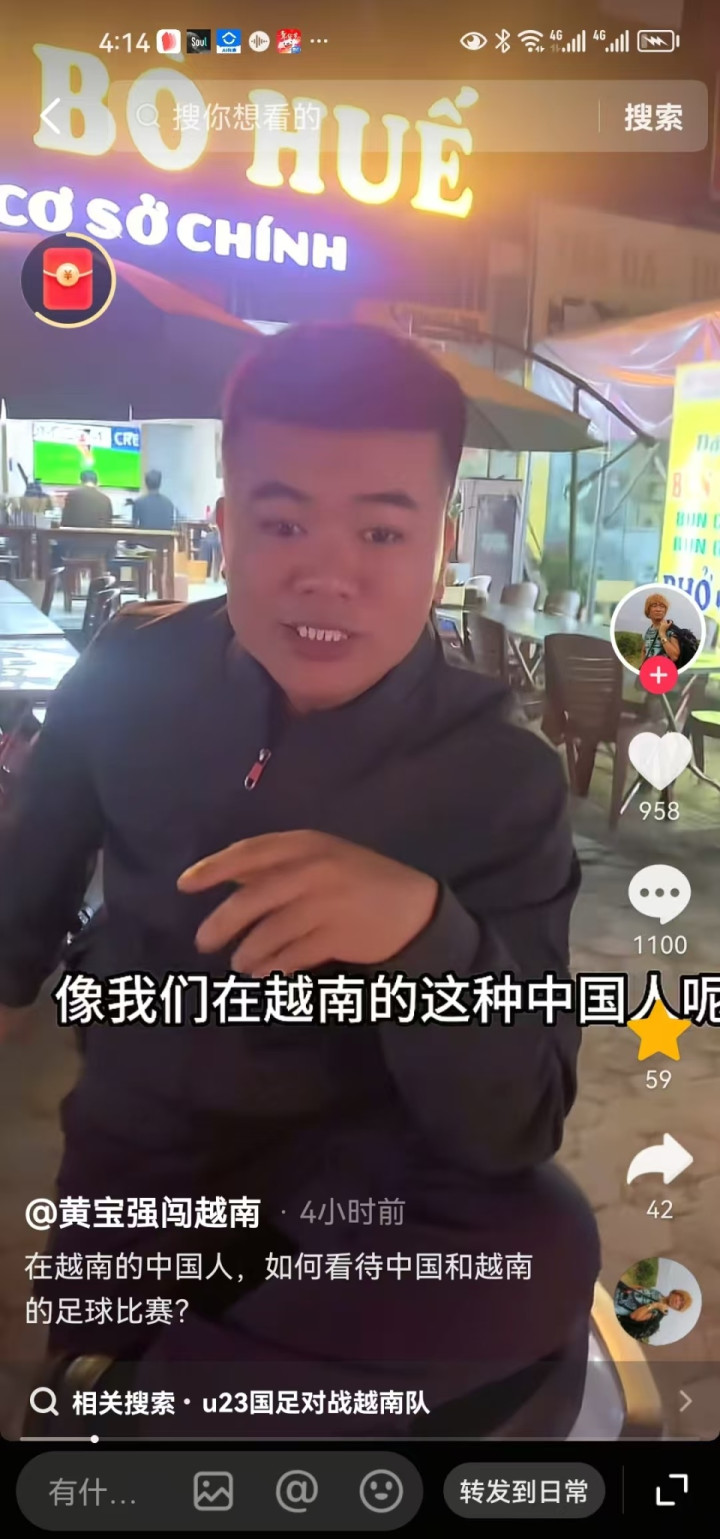 一个叫“黄宝强”的在越中国博主,比赛中调侃地说:“今天晚上可能又是一个丢脸的晚上,像我们这些在越南的中国人呐。现在越南的大街小巷都放着中国男足与越南男足的比赛。虽然现在还是0-0,但是我觉得今天晚上应该是很丢脸的一个晚上。因为越南人赢哪个国家不重要,他们现在就是觉得赢中国是最重要的。如果真让他们赢了,那等一下马路上那种氛围啊,我不敢想象。”