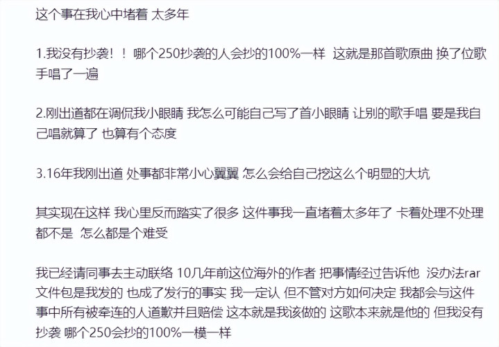 还承诺全额承担版权用度和后续抵偿,以致发誓今后不在公开步地演唱这首歌。