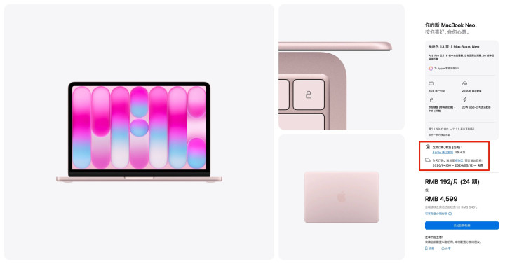 凭证苹果官网,MacBook Neo 起步款 256GB 机型的发货日历如故蔓延至 2-3 周,广州区域的瞻望投递日历现时涌现为 4 月 30 日至 5 月 12 日。
