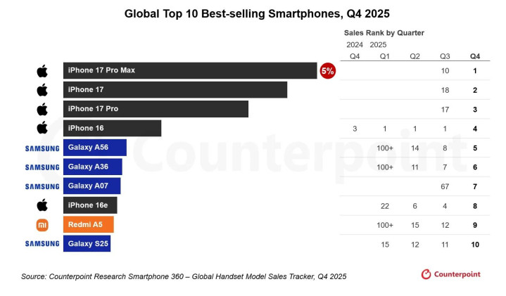 凭证统计机构 Counterpoint Research 的数据:苹果在 2025 年第四季度全球智妙手机销量中霸榜前四,123 名折柳为 iPhone 17 Pro Max、iPhone 17 和 iPhone 17 Pro。