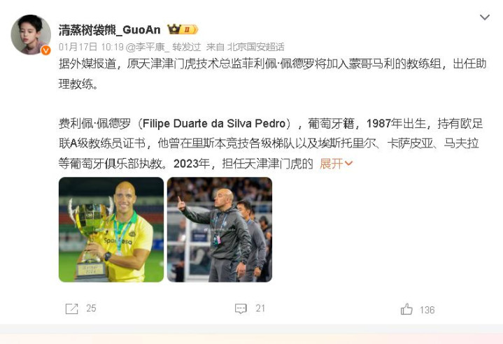 当葡萄牙籍教练菲利佩·佩德罗的行李箱从纳米比亚转向北京时,中超教练圈的暗战已悄然升级,这位38岁、手持欧足联A级证书的战术大师,从天津津门虎技术总监摇身一变,成为北京国安新帅蒙哥马利的“左膀右臂”。这场跨越三大洲的执教轨迹背后,藏着中超新赛季最值得期待的“教练组化学反应”,面对天津津门虎球员如何应对?