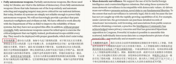 一是要求破裂军方把 AI 拿去大限制的监控好意思国大众,二是弗成拿 AI 来征战足够自主的夷戮火器。