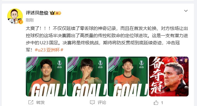 直播吧01月21日讯U23亚洲杯,U23国足3-0击败越南U23,成功晋级决赛。赛后,评述员詹俊转发直播吧海报,开云体育app并发文评价比赛。