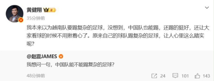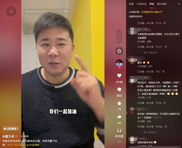 前国足名宿董方卓则是直接破防了,他此前认为这场比赛中国队还是要主打龟缩防守,求稳为主,在赛后球迷也直接涌入了董方卓的评论区,问他今天是什么味的巧克力,画面也十分搞笑。