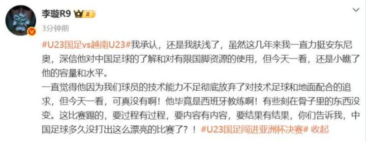 足球报记者李璇则是公开向安东尼奥道歉,表示是自己肤浅。此前虽然支持安东尼奥,但还是小瞧了他的容量和水平。通过国足和越南的比赛,大家看放弃了技术足球和地面配合,打出了过程内容和结果,不会是西班牙籍教练。