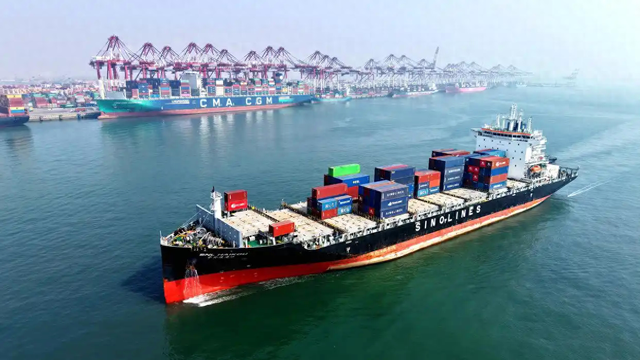 在山东港口青岛港,一艘装载集装箱的货轮驶入港口(无东说念主机相片)。新华社发(俞方平摄)