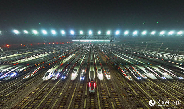 一年一度的春运即将开启,2026年铁路春运自2月2日开始,至3月13日结束,为期40天,全国铁路预计发送旅客5.39亿人次、同比增长5.0%。1月24日凌晨,华中地区最大的动车检修基地——武汉动车段,一列列检修后的动车组在铁轨上整齐排列,如“万箭齐发”,又似“陆地舰队”,即将奔驰在祖国广袤的大地上,迎接旅客回家团圆。人民网记者雷声摄